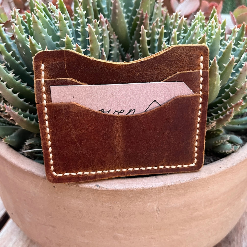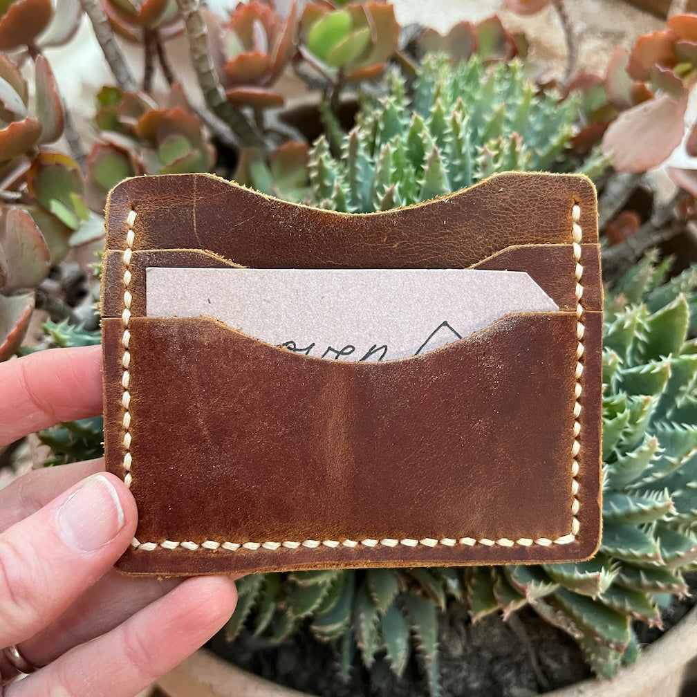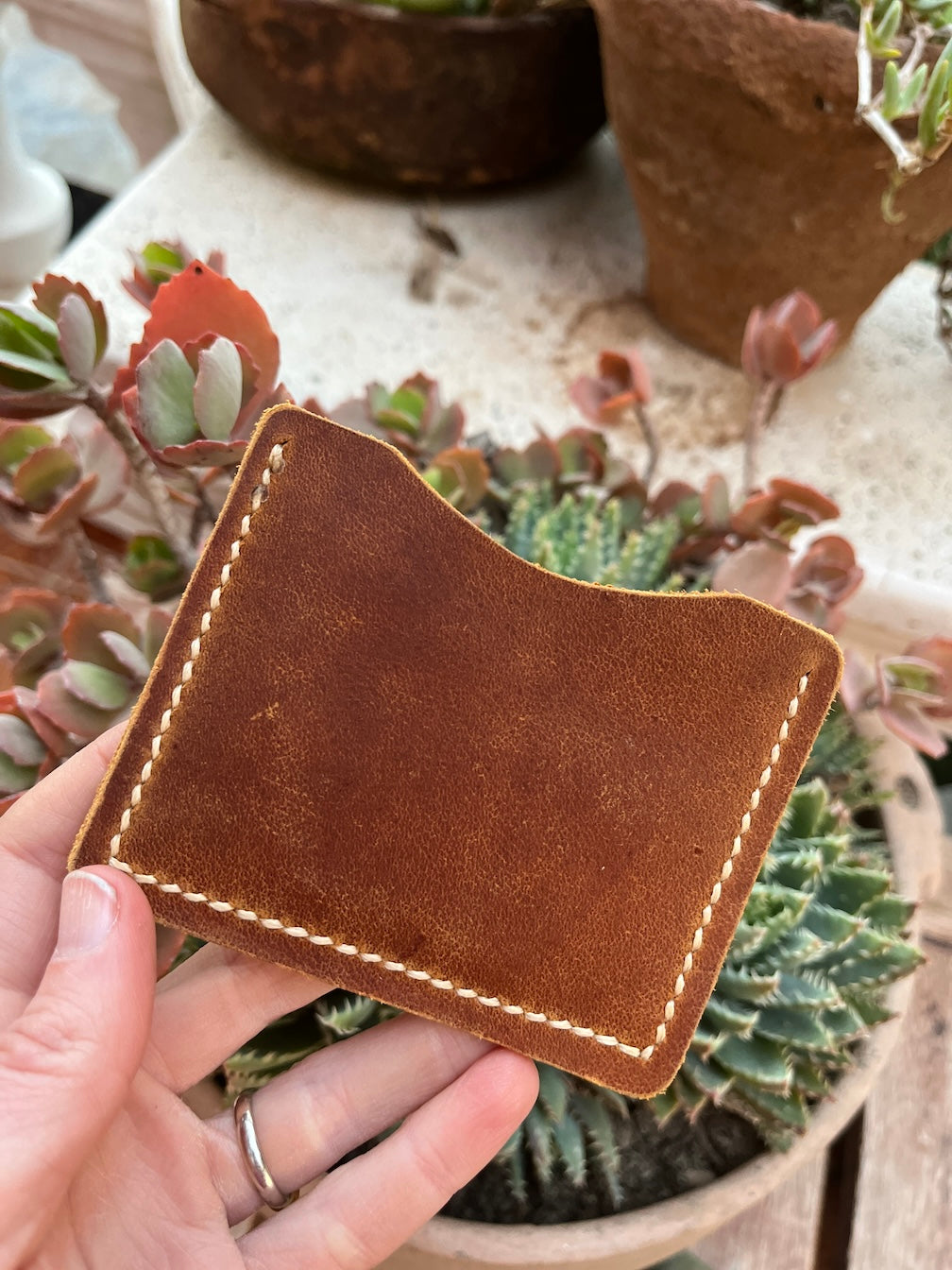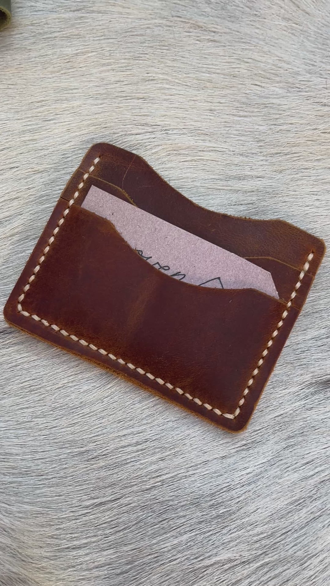 Crafted with natural cow leather, this wallet is made to last. Cut, glued, assembled, stitched, and finished by hand, guaranteeing a quality product. This wallet has 2 credit card slots and a larger pocket to carry folded currency. It's big enough for everyday carry, small enough to fit in your pocket easily.