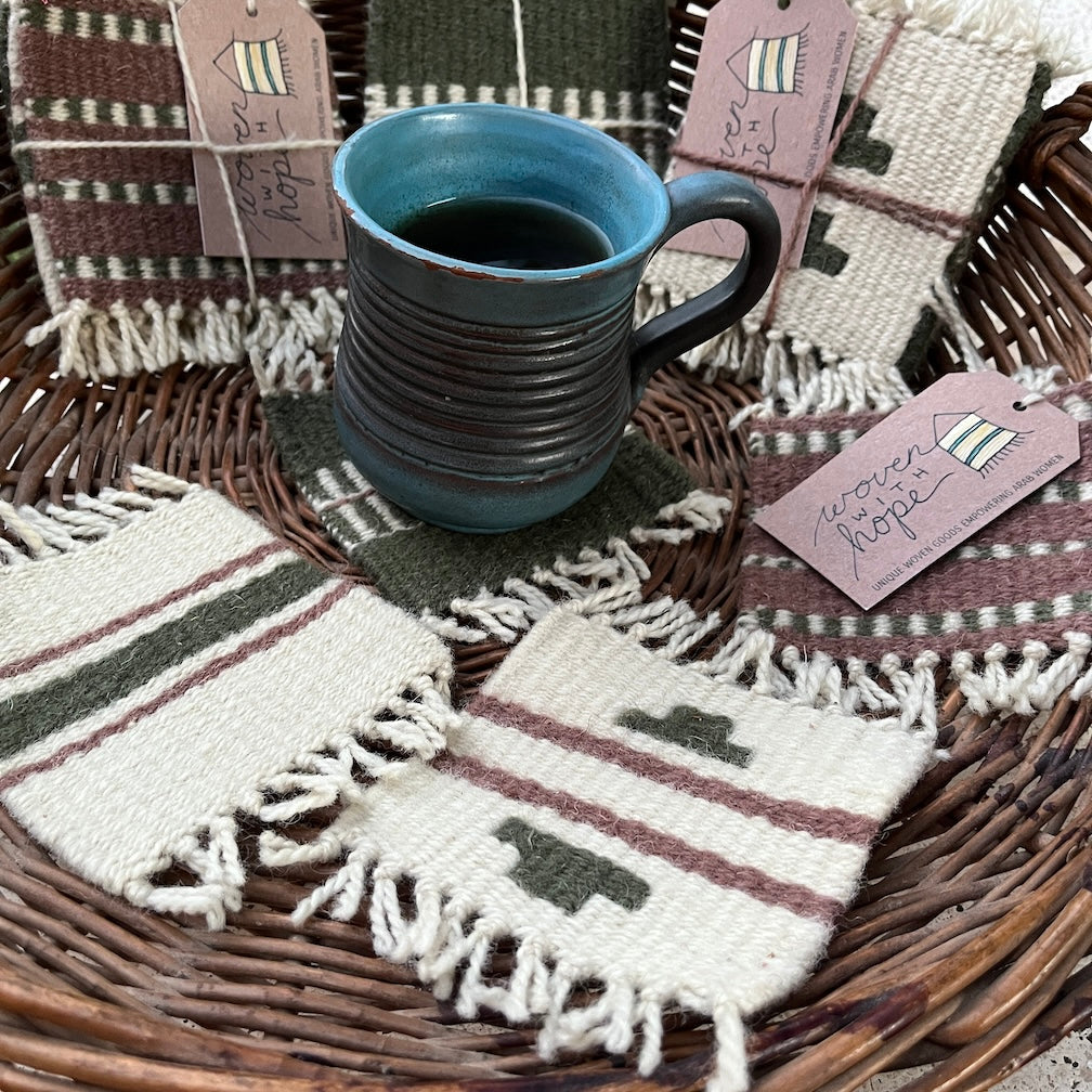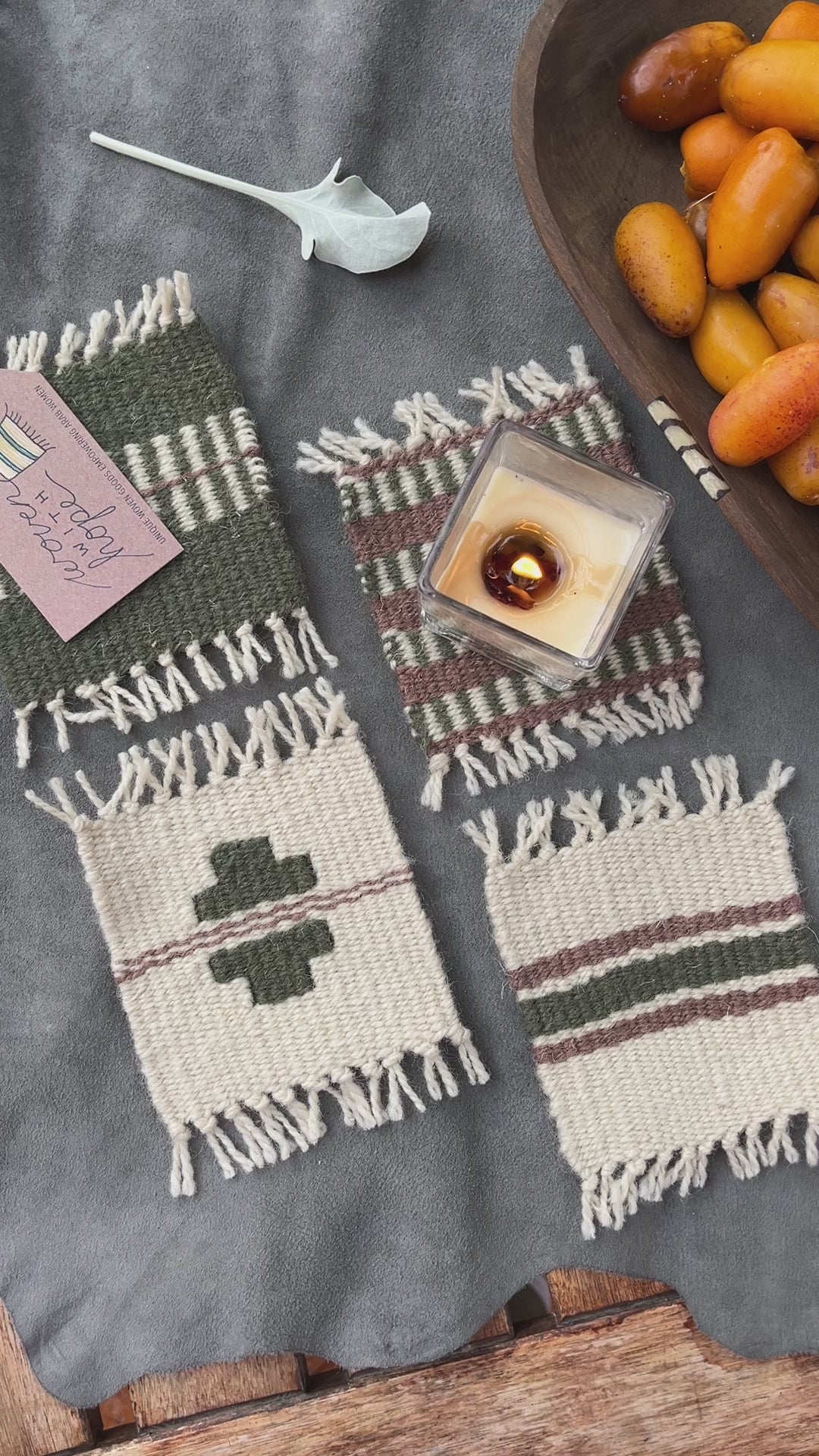 We decided to try something different with this coaster set. Instead of our normal set of 4 matched coasters, with this set, each of the four coasters has a different design, using the same colors. Because wool is a natural insulator, these coasters will protect your furniture from heat and prevent rings, or they also work beautifully as candle or plant mats.