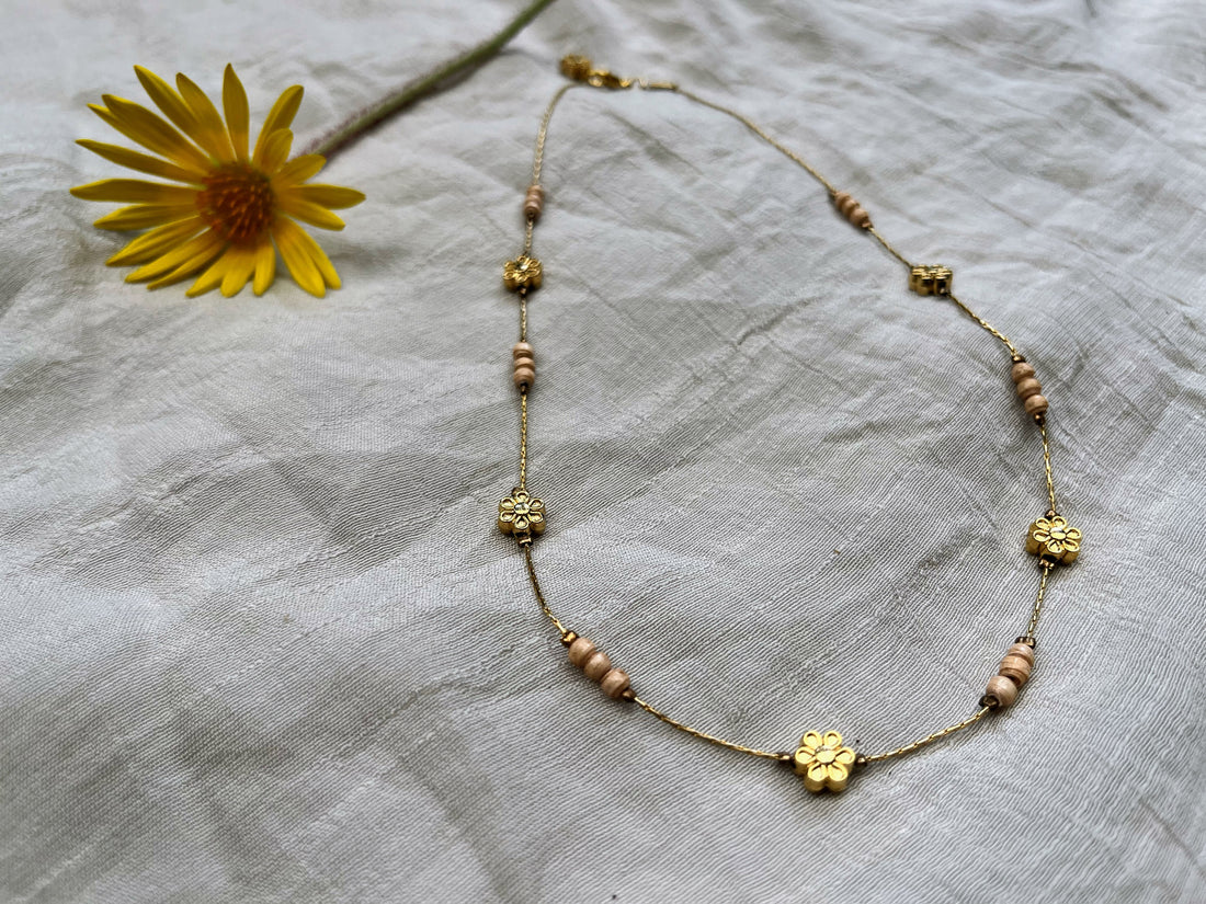 Delicate gold chain with dainty daisies and Ugandan paper beads.