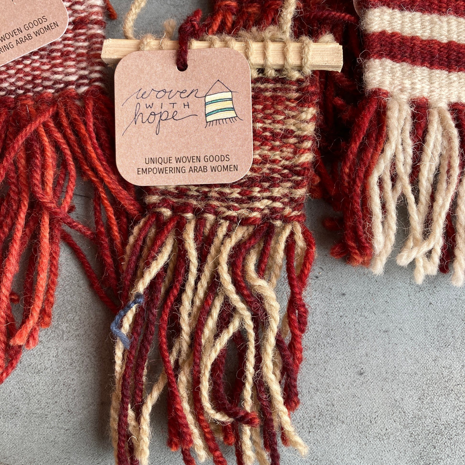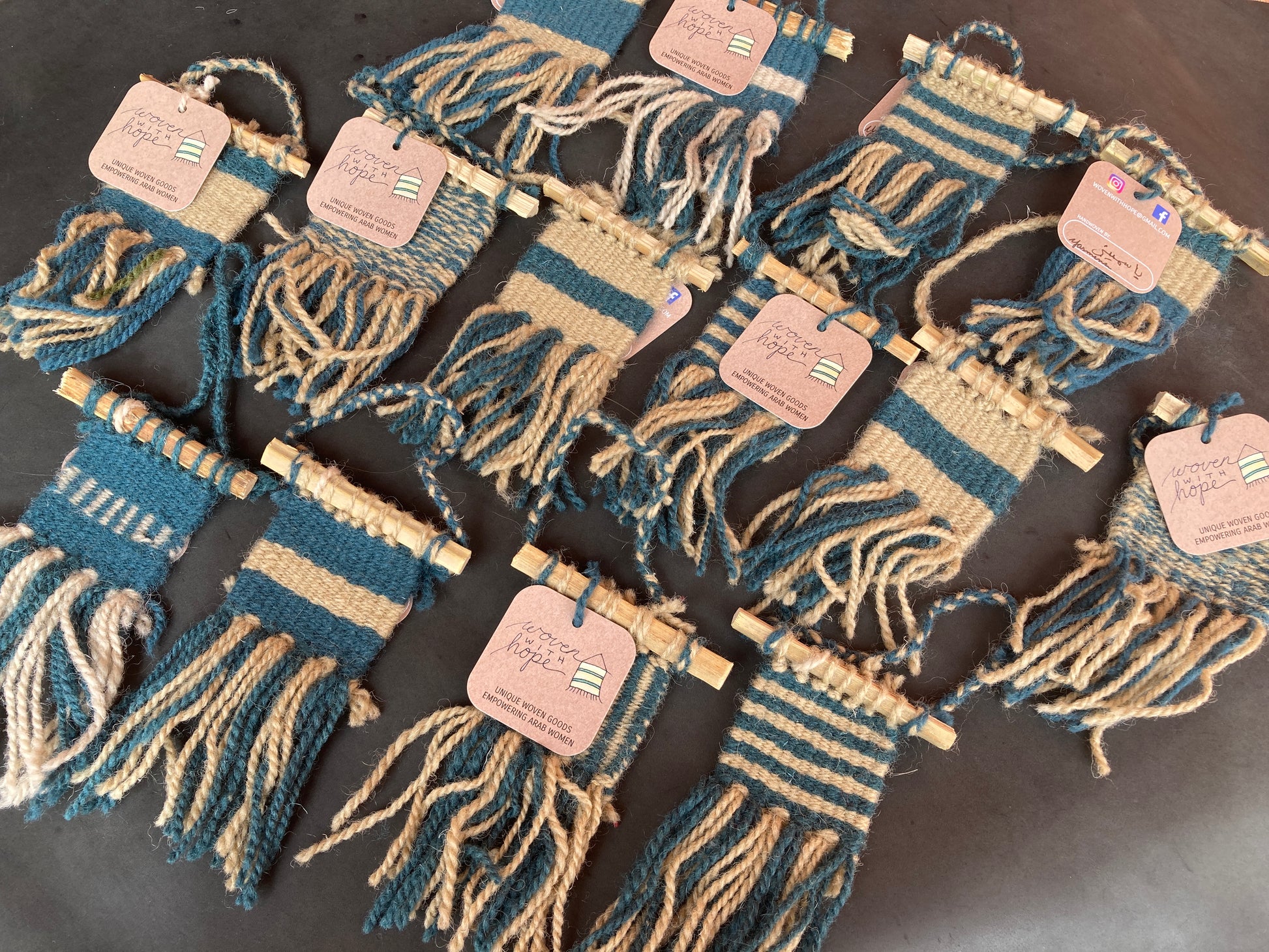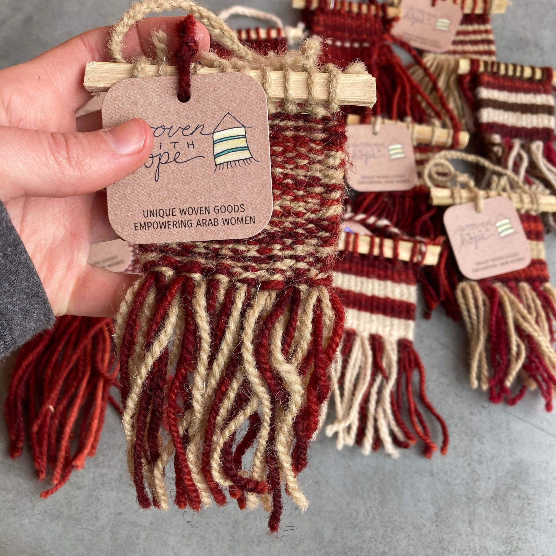 This rear-view mirror charm is hand woven from wool and mounted on a small section of date palm frond. Each of these items is one-of-kind and colors and styles vary. You will receive one of the mini-tapestries pictured in your selected color, but we cannot guarantee a specific design. These also work beautifully as wall decor or ornaments!