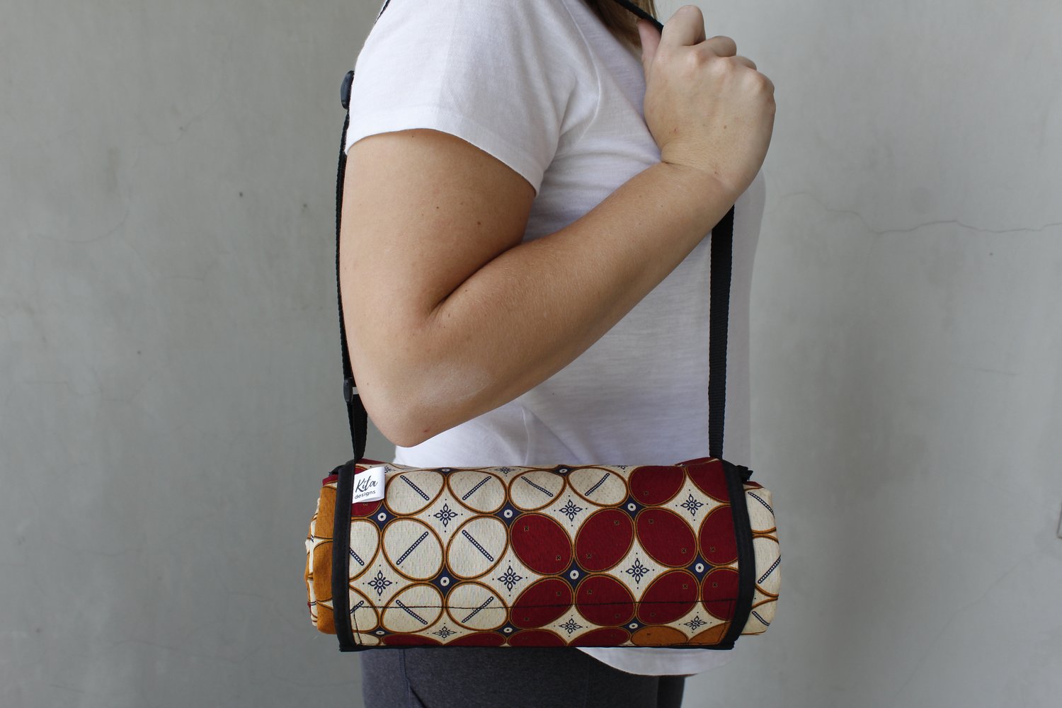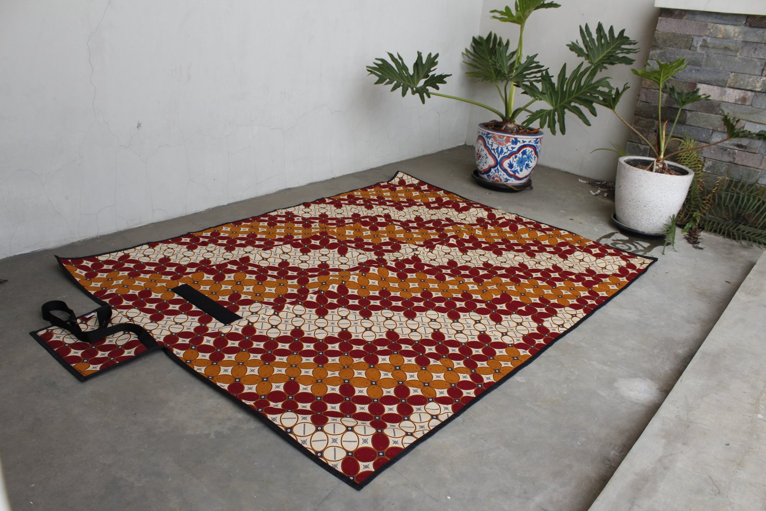 Beautiful roll-up picnic mat with water resistant fabric on the bottom side and traditional Indonesian batik designs on the top side!