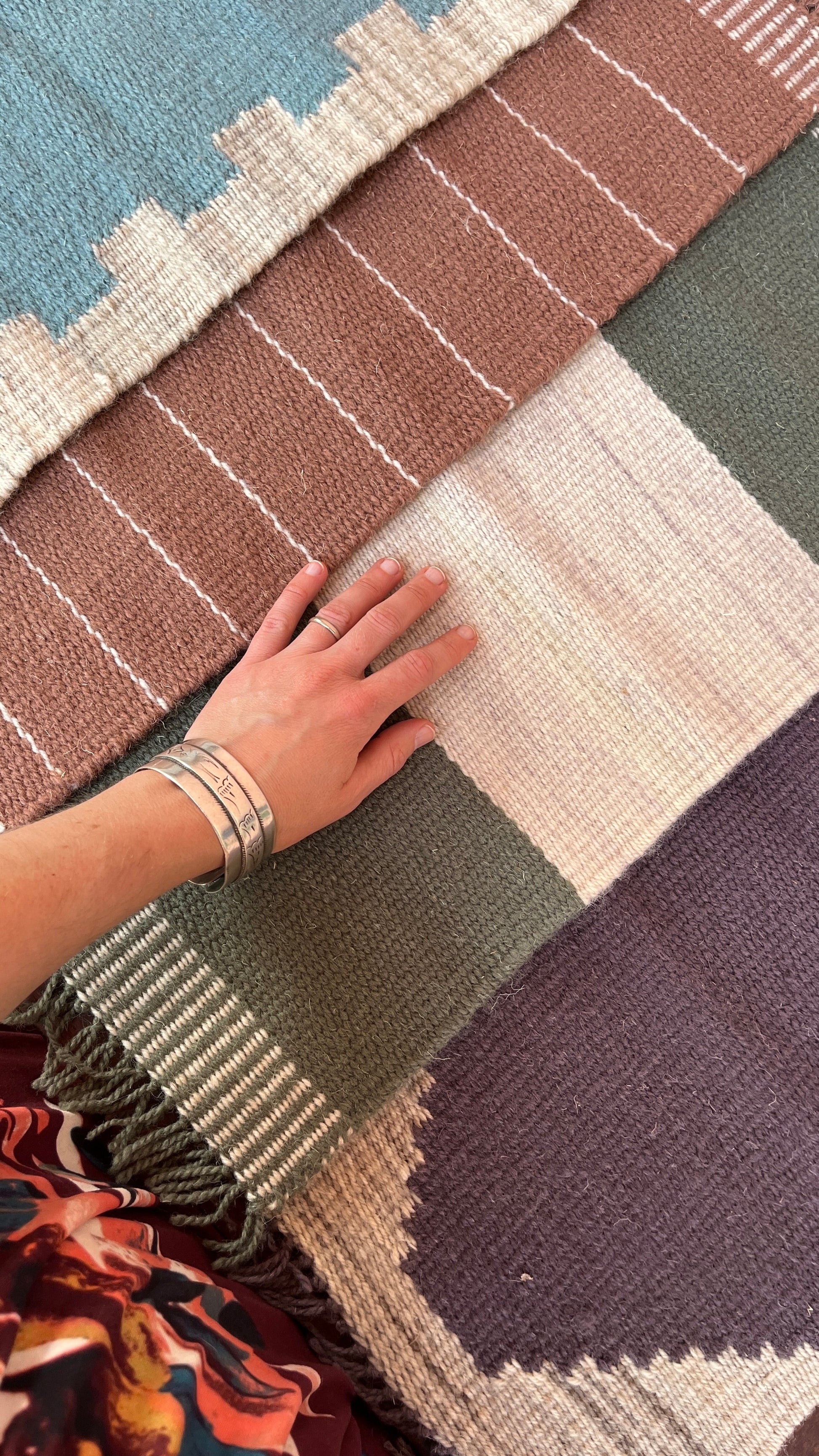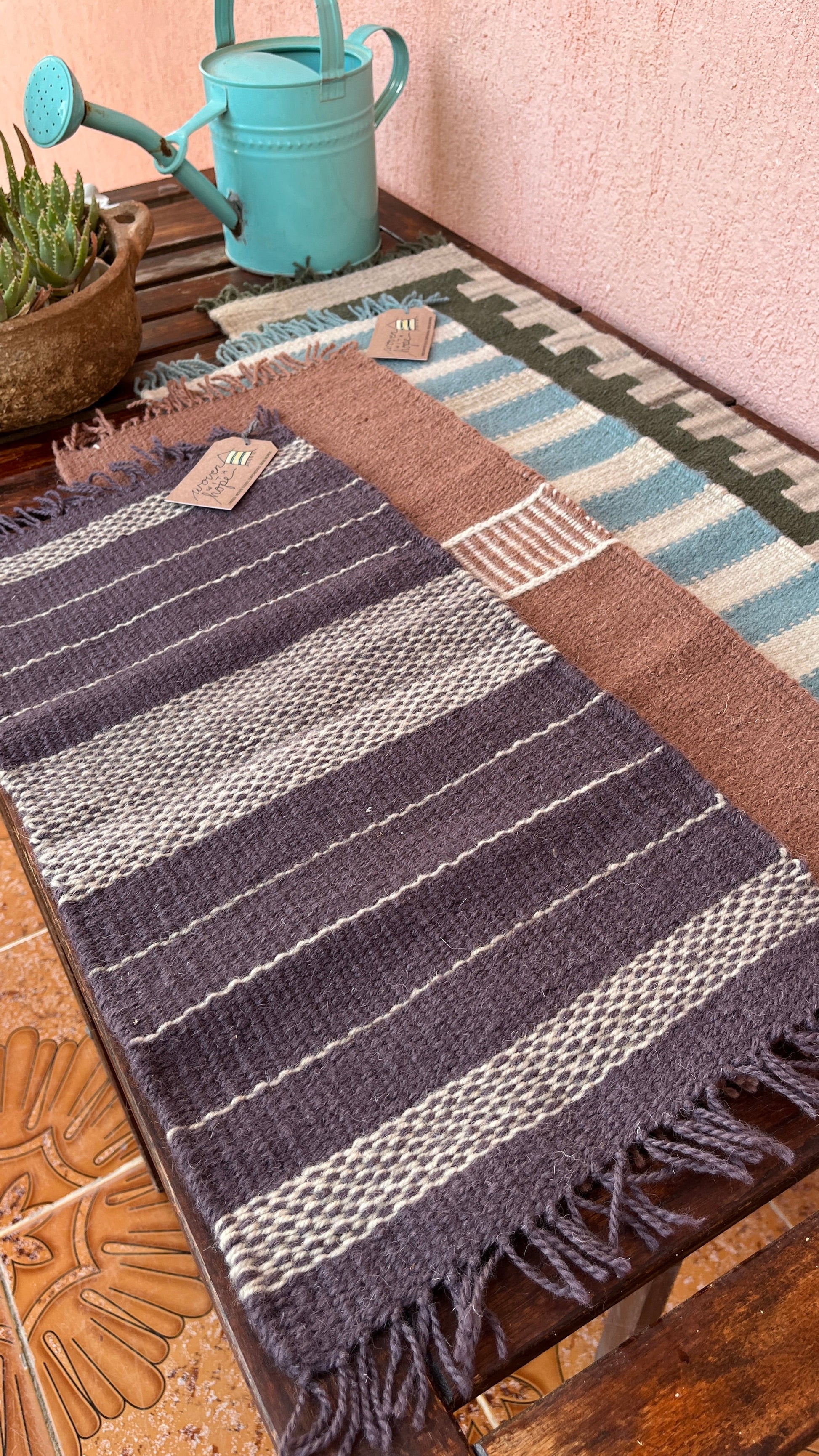 Each table runner is unique, woven by hand from 100% wool yarn. Because wool is a natural insulator, these table runners protect your furniture from moisture or heat, easily fitting up to three hot dishes. These runners are listed as a color set, inspired by the color of our North African home. You will receive one of the runners pictured in the selected color, but we cannot guarantee a specific pattern. These also work beautifully as decor adding textural interest to your coffee table, dresser, or shelf.