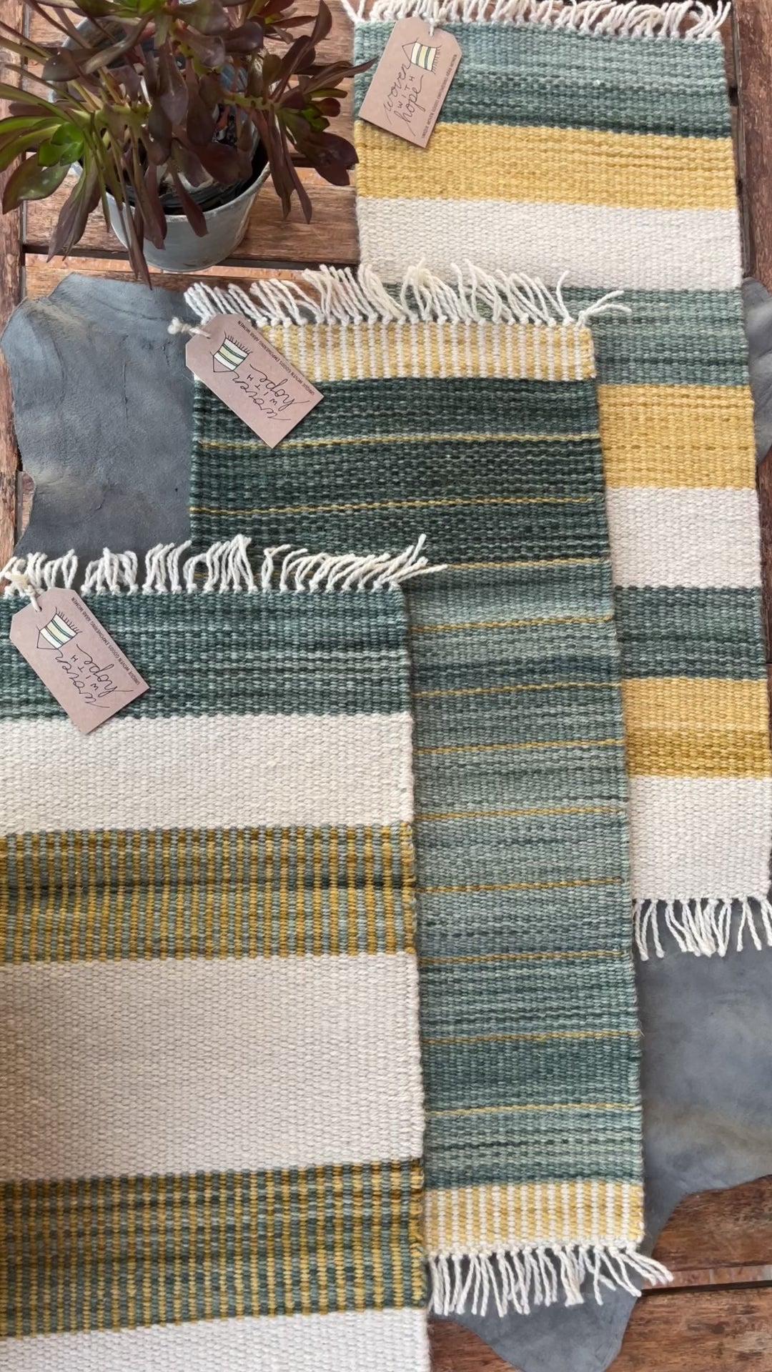 Each table runner is unique, woven by hand from 100% wool yarn. Because wool is a natural insulator, these table runners protect your furniture from moisture or heat, easily fitting up to three hot dishes. These runners are listed as a color set, in teal and yellow. You will receive one of the runners pictured, but we cannot guarantee a specific pattern. These also work beautifully as decor adding textural interest to your coffee table, dresser, or shelf.