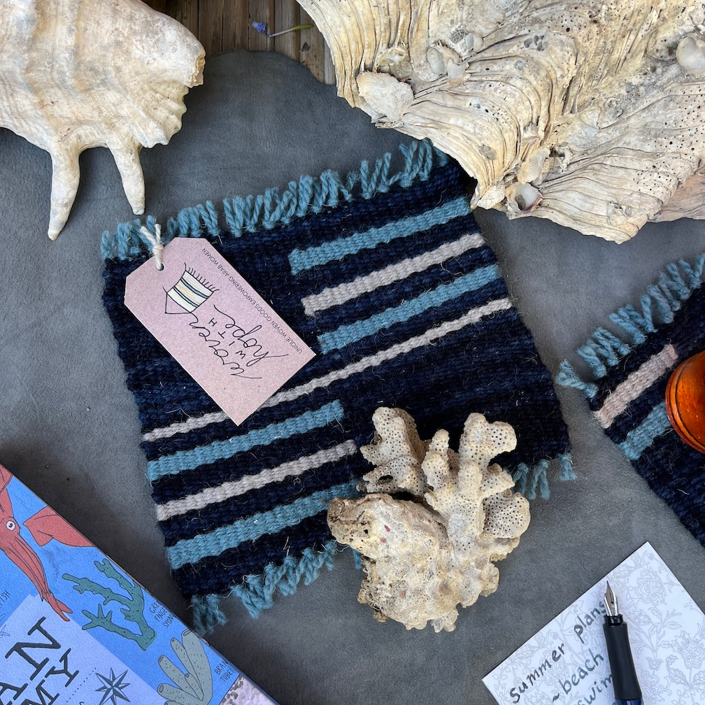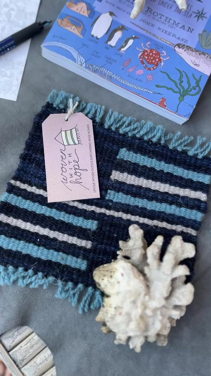 This handwoven trivet will help protect your table, while also adding color and textural interest to your dining décor. These also work beautifully as candle or plant mats. This blue and white trivet will go with almost any aesthetic and will last for years to come. As part of our Harbored collection, this piece celebrates the fun of a summer day in the waves and the warmth of seaside memories from years past.