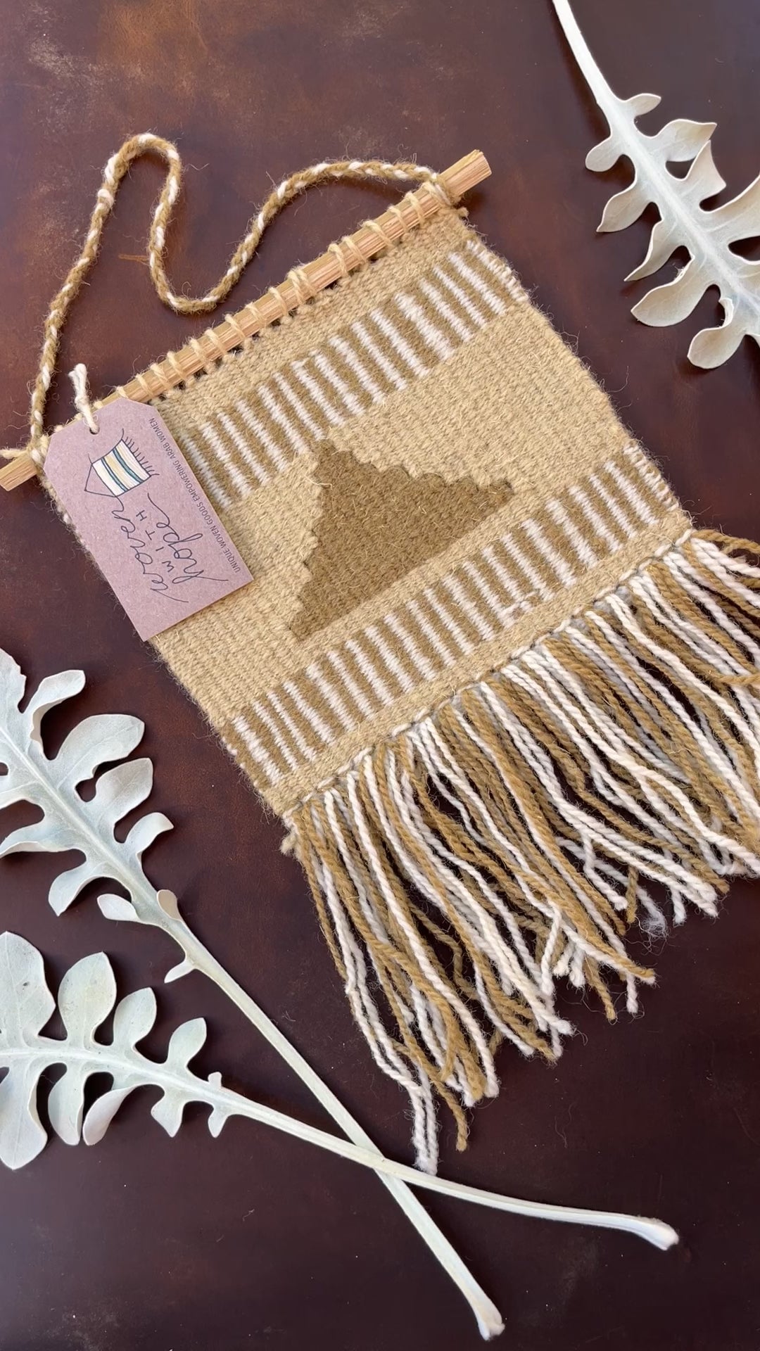 This wall art was woven entirely by hand in a process that took several hours. It has been hand tied onto a section of date palm frond with a braided yarn hanging-string. Hang these on a door, in your dorm room, or in your office to add color and textural interest. They also make great gifts!