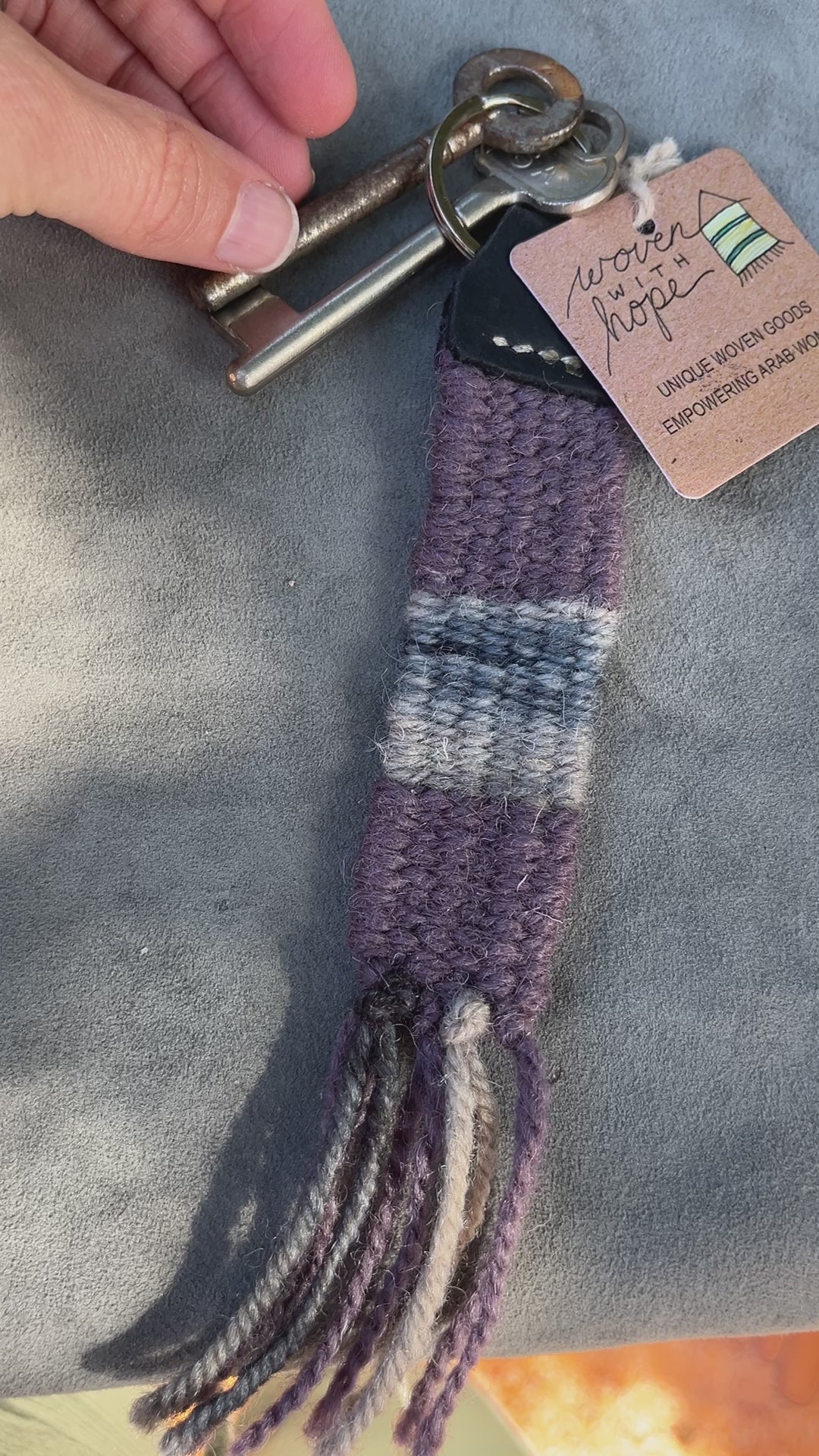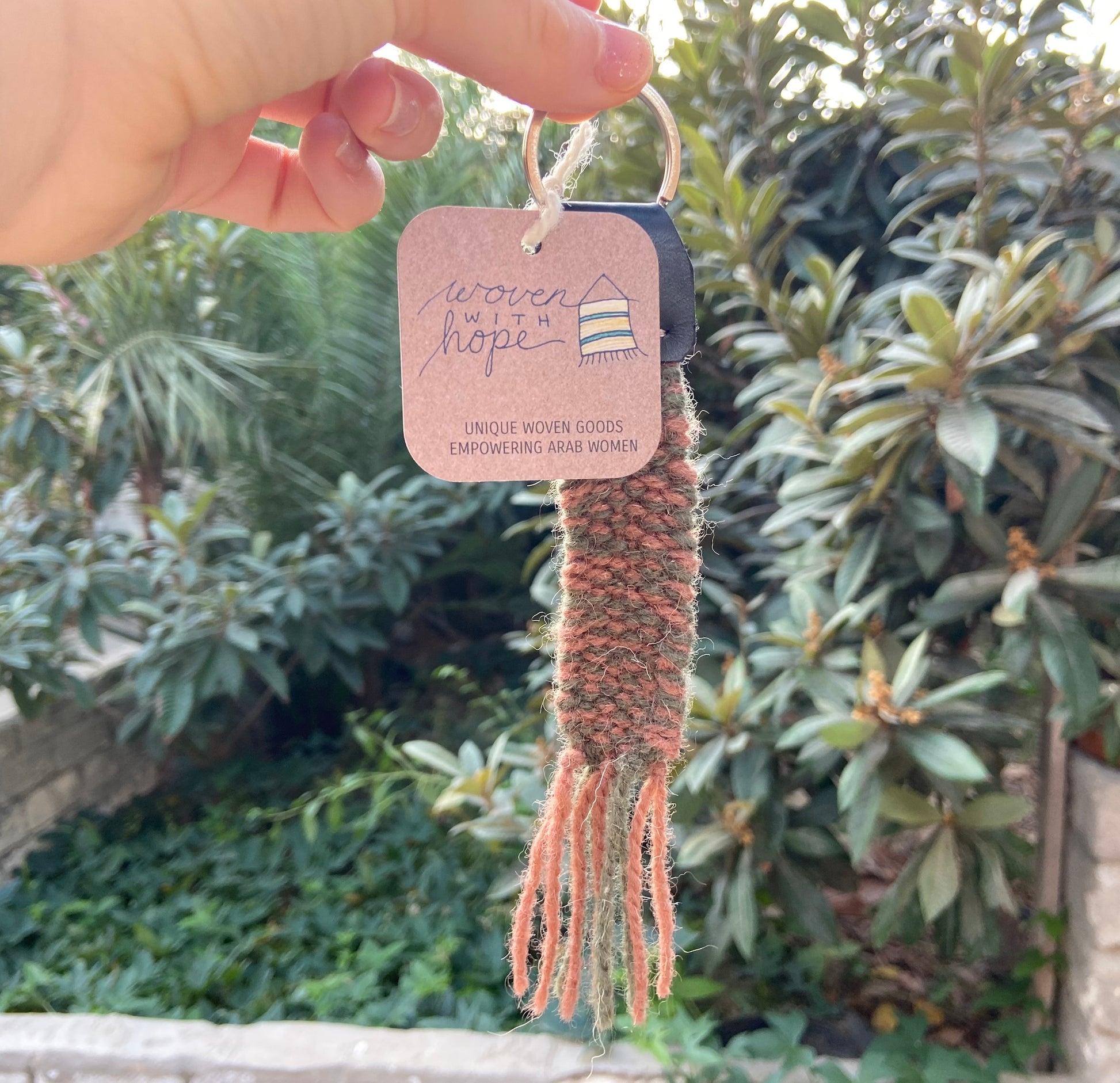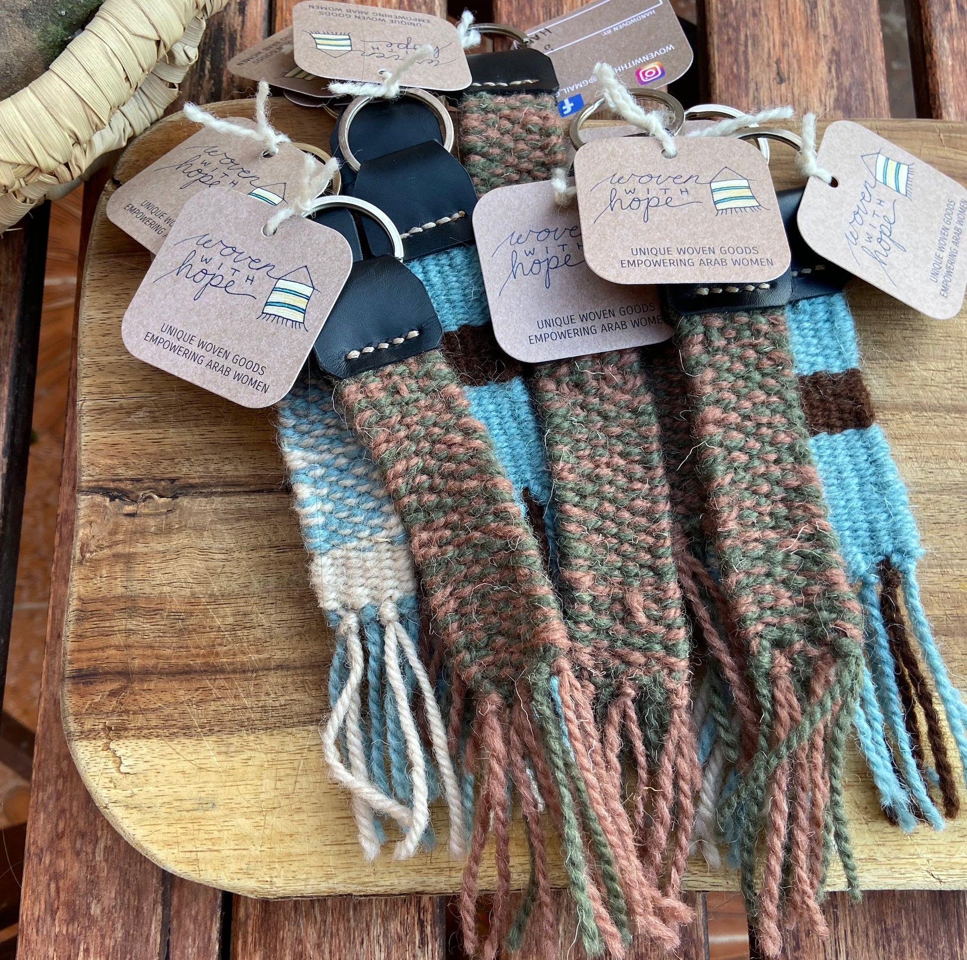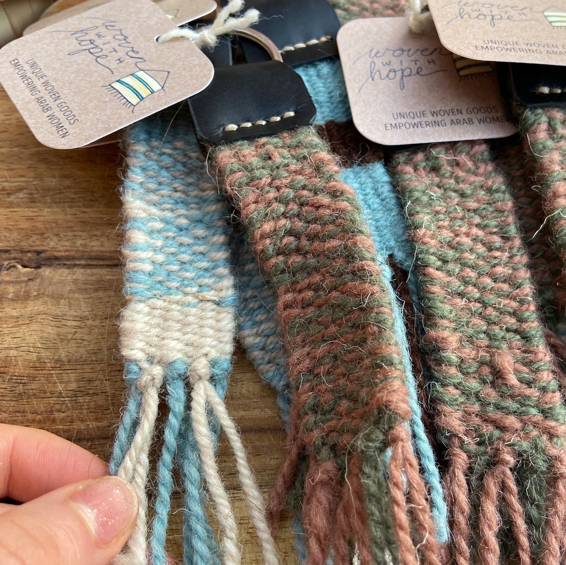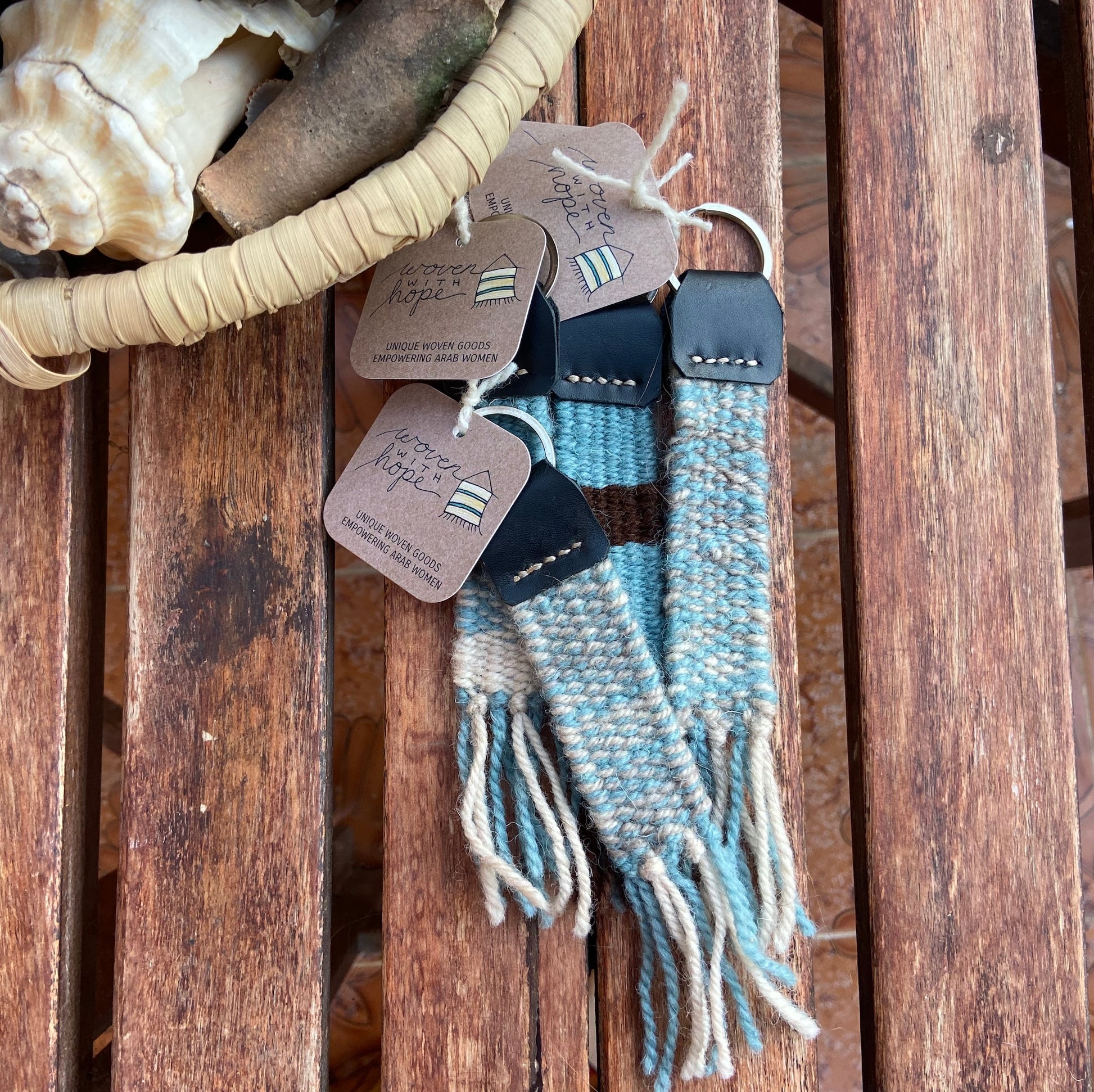 These unique keychains are woven by hand and have a leather loop with keyring. The keychain is the first product our artisans learn to make, and for many, represents the first time they created something by hand. These keychains are a cooperative effort with one artisan weaving the body and another hand-stitching the leather loop onto the top.